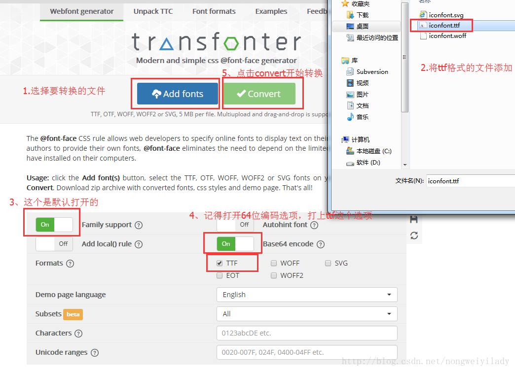 進入https://transfonter.org/平臺,將解壓出來的ttf字體文件轉(zhuǎn)化成base64格式。流程如下: