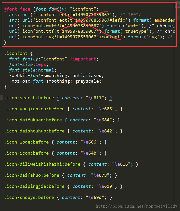 2–打開沒有轉(zhuǎn)換過的download.zip解壓出來的文件,找到iconfont.css文件,將這個文件中的沒有打岔的內(nèi)容復(fù)制到index.css文件中。@font-face這部分不要,只要下邊的這部分。